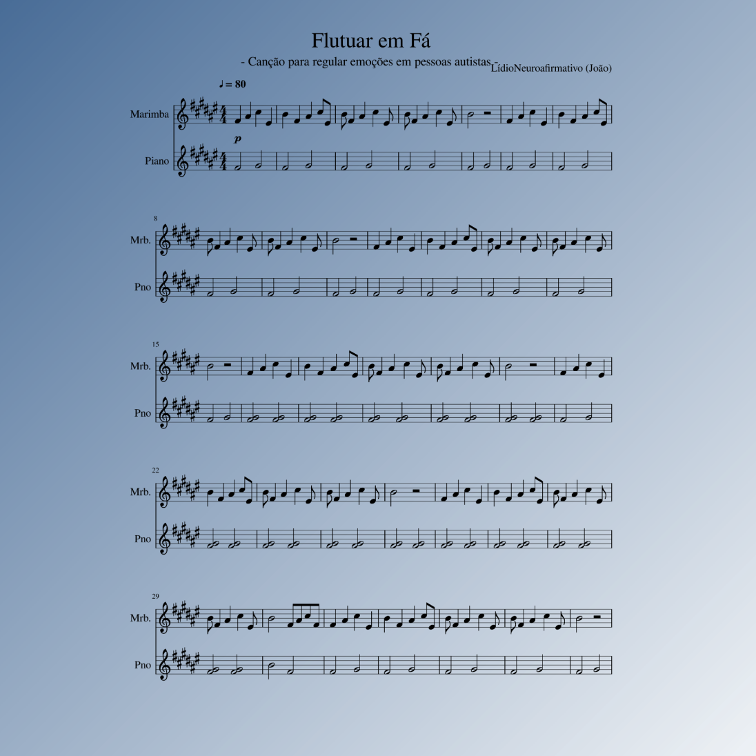 Esta é minha primeira composição para autistas e ela serve para regular as emoções. Autistas gostam de previsibilidade e não gostam de mudanças. Do mesmo modo as abordagens devem ser claras, literais e não-invasivas. Portanto, esta música leva isso em consideração. Aqui criei um loop, de base formado pelos acordes de Fá e Sol. Essa progressão é simples, repetitiva, estável e oferece previsibilidade. Esta nota é não demandante, ou seja, não existe tensão harmônica que pode exigir certos padrões emocionais e afligir o autista e, portanto, não exige que seja resolvida. Não existe na música o efeito montanha russa, muito comum nas canções do cotidiano. Trata-se de um fluir, um flutuar leve. Criei uma melodia com pequenas variações e pausas, com as notas Fá (F), Lá (A), Dó (C) e Mi (E) que juntas compõem um acorde de Fá com sétima maior (F7M) e inseri como repouso a (quarta aumentada) #4 que é a nota Si (B) que é nota mágica que caracteriza o modo lídio. A nota Si traz expansão, novidade, abertura, otimismo, esperança, a sensação de flutuação.
